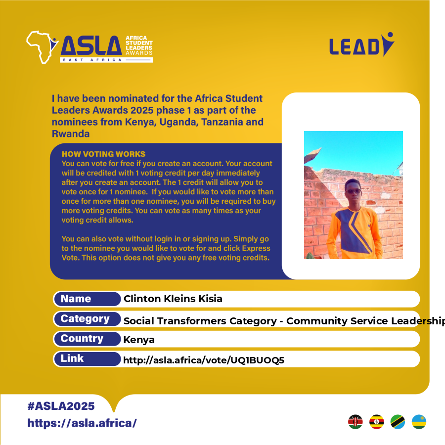 Your voting is only limited by your creditsNominees for Social Transformers Category - Community Service Leadership Award. (Evans Wadongo Award) (Under 30) - General